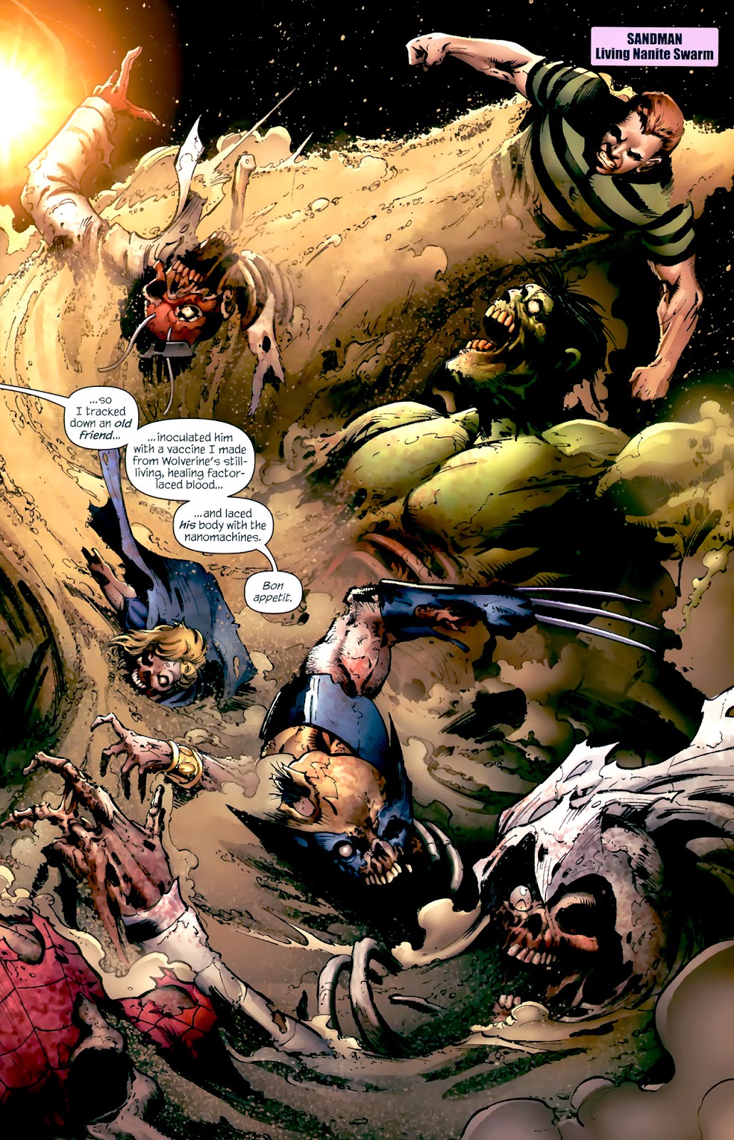 During his assembly of the New Avengers, he stored 91126’s native Sandman in a canister, and coated his body in Tony Stark’s necrotic-tissue destroying nanites and an extract of Wolverine’s healing factor which work on a sub-atomic scale, which would allow him to kill any necrosed being regardless of durability.