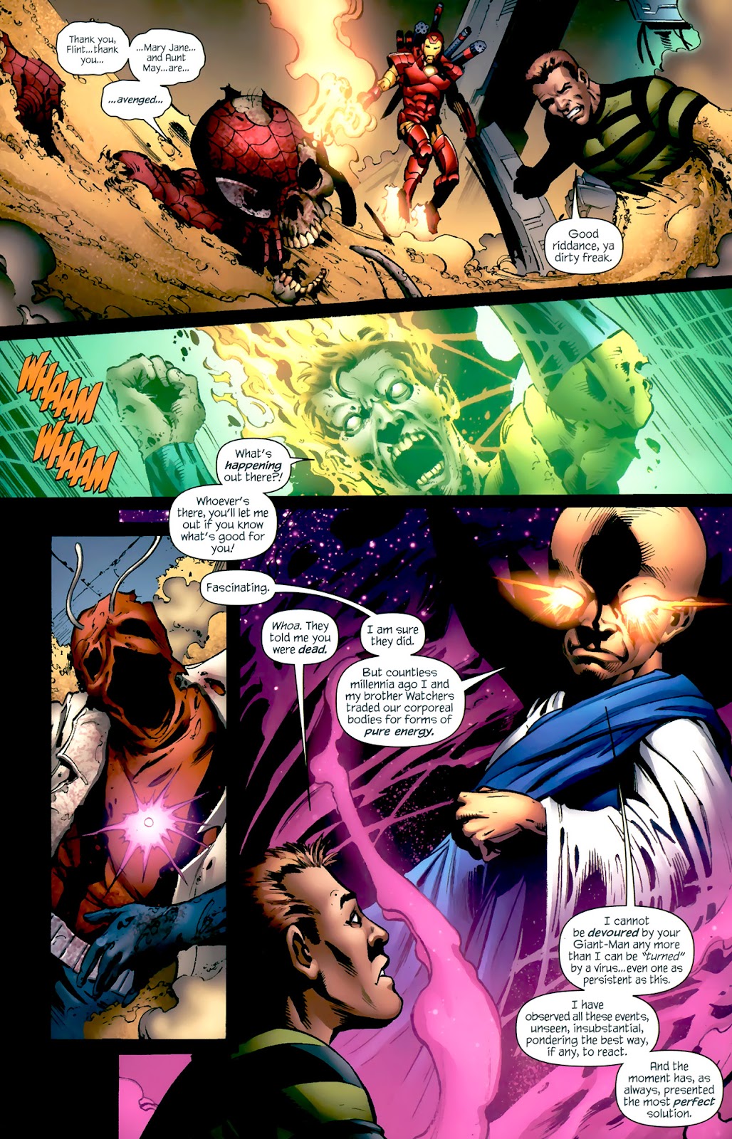 Now it’s time to compare this to his wall crawling, flesh eating opponent. Zombie Peter despite his rotting body was nothing to scoff at. He could easily dent in concrete walls like it’s nothing, reduce an an entire zombified Sinister Six to nothing in mere seconds, tanked Magneto lobbing a bunch of oil tankers at him which then exploded, which would most likely result in an energy with 350 Tons Of TNT, and through scaling to the other Zombies Peter being this high really wasn't all too strange as character such as Hulk and Sentry can shatter fragments of Skyscrapers which got to about 1.54 Kilotons Of TNT. Peter also molly whopped the Sinister Six of Earth-91126 which is directly stated to be pretty much identical to Earth 616. This means scaling Zombie Pete to Human Pete isn't the craziest idea ever, and 616 Spidey is capable of many feats which range from Large Town level to City level, namely him scaling to Carnage, who was able to contain the Gene Bomb which got to 3.7 Megatons Of TNT on a low end and 1.8 Gigatons Of TNT on a high end. All this together put Base Peter anywhere from City to Large Mountain… Keyword; Base. When using Power Cosmic, Peter should reasonably massively upscale all of these feats and has many more, from surviving the destruction of a Planet worth over 17 Yottatons Of TNT, to scaling to the other Zombies Namely the Sentry who was capable of hitting with the force of a million exploding suns and most impressively, breaking the dimensional barriers separating space-times to reach 2149. Considering he had to rip apart space and time this would mean this feat would be a Universal+ Feat. This is even crazier as Zombie Peter should also scale to the biggest opp in the world Zombie Hank Pym, who was shown being able to kill the Watcher who was generally compared to Galactus. This put Zombie Peter at Universal+ When using The Power Cosmic.