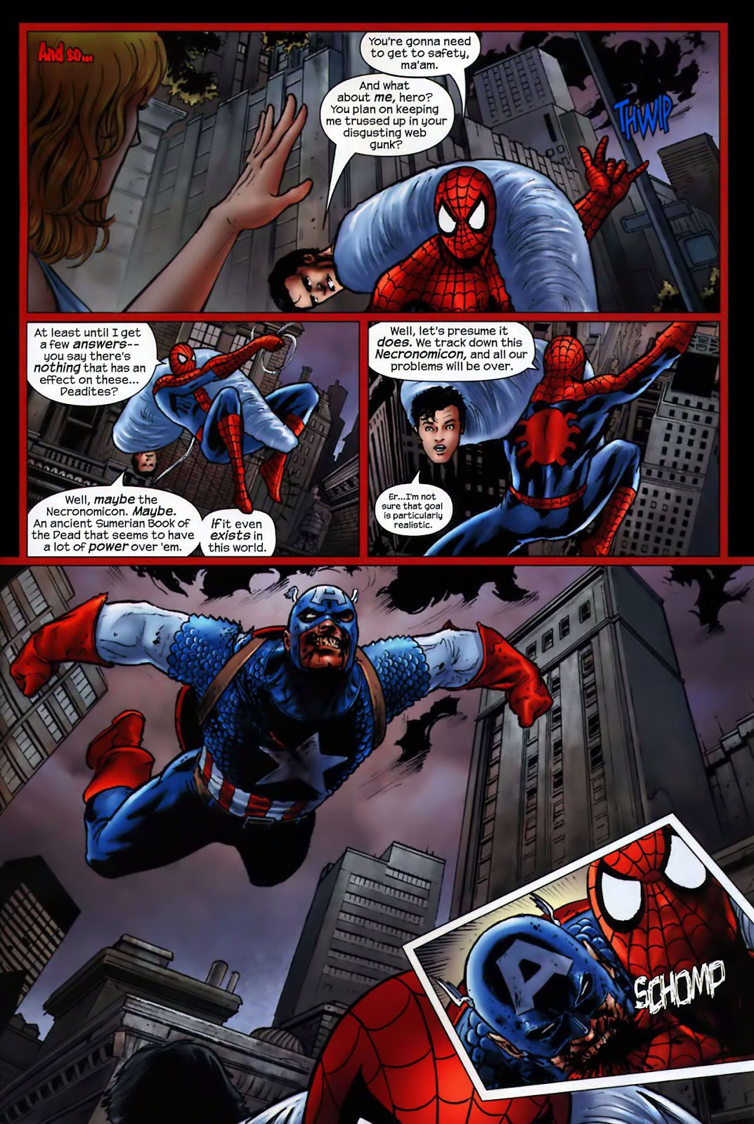 But most of the Avengers of this world dismissed him, including Colonel (not Captain) America, who tasked Spider-Man with taking Ash and swinging away while he and the others checked out the purple lightning. And in no time, the zombified Sentry infected the Avengers, leaving few survivors, the ones right now being Ash and Spidey, the only problem was… Peter was bit. Although, luckily for him, his healing factor worked overtime to try and save him. Just enough to fool the Zombie Avengers and save Ash from becoming their meal. In his final conversation to Ash, he drops his new friend off on a building as he swings off to try and save MJ and Aunt May, but alas, he had succumbed to the Hunger Virus as he had arrived, ending his life.. But starting his un-life. This resulted in Peter cannibalising both his Aunt May and his wife Mary Jane… Jesus.