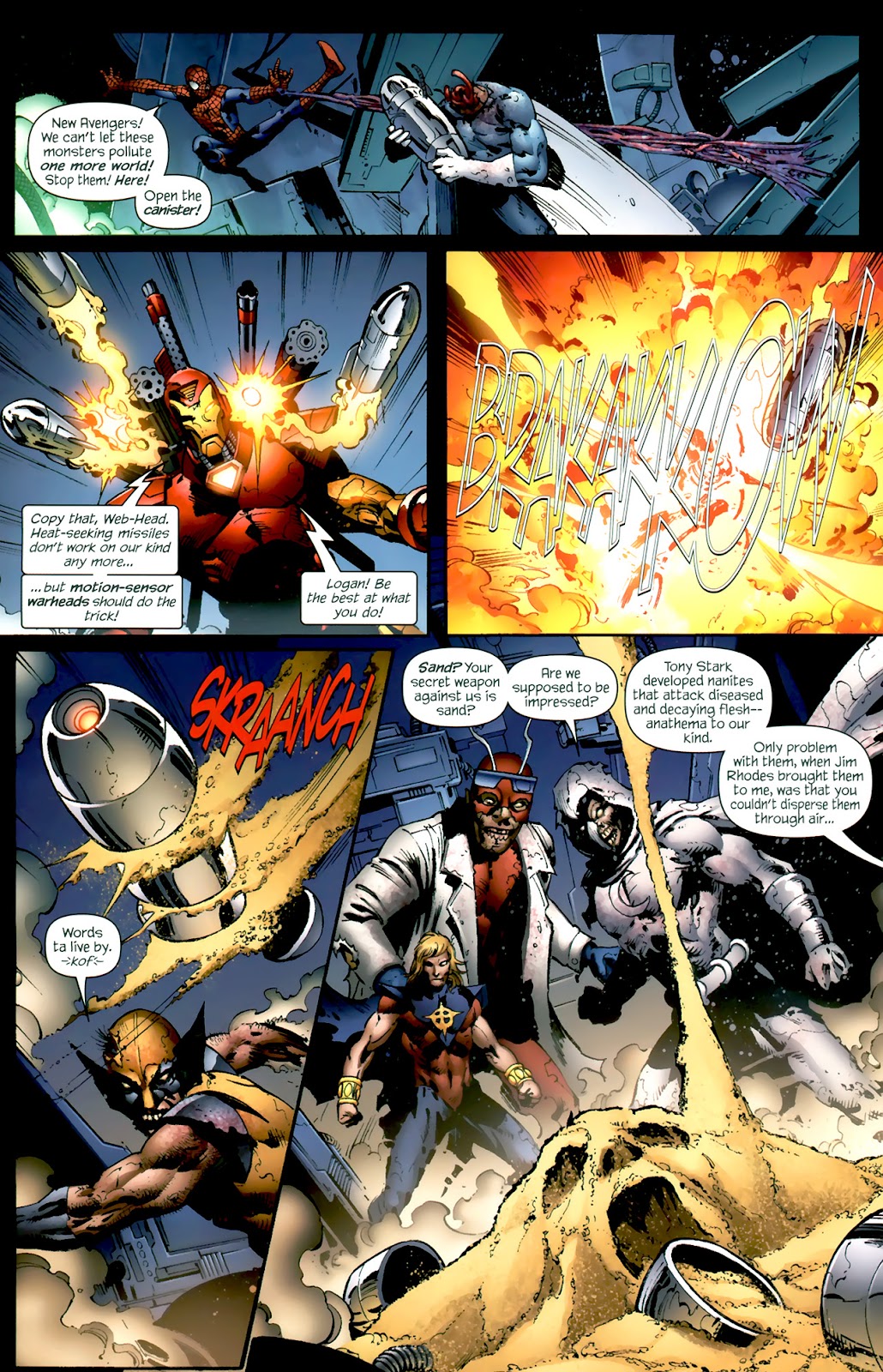 During his assembly of the New Avengers, he stored 91126’s native Sandman in a canister, and coated his body in Tony Stark’s necrotic-tissue destroying nanites and an extract of Wolverine’s healing factor which work on a sub-atomic scale, which would allow him to kill any necrosed being regardless of durability.